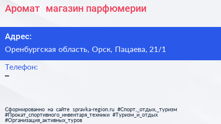Аромат+, магазин парфюмерии по адресу Оренбургская область, Орск, Пацаева, 21/1 в дальнейшем Организация, размещена в следующих категориях: