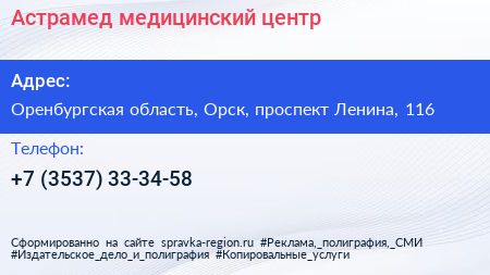 Астрамед, медицинский центр по адресу Оренбургская область, Орск, проспект Ленина, 116 в дальнейшем Организация, размещена в следующих категориях: