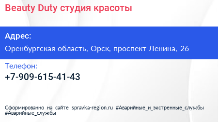 Beauty Duty, студия красоты по адресу Оренбургская область, Орск, проспект Ленина, 26 в дальнейшем Организация, размещена в следующих категориях: