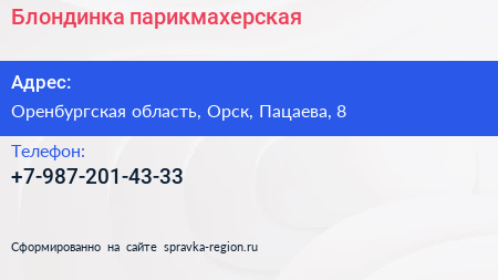 Блондинка, парикмахерская по адресу Оренбургская область, Орск, Пацаева, 8 в дальнейшем Организация, размещена в следующих категориях: