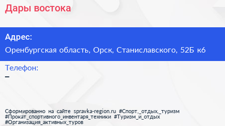 Дары востока по адресу Оренбургская область, Орск, Станиславского, 52Б к6 в дальнейшем Организация, размещена в следующих категориях: