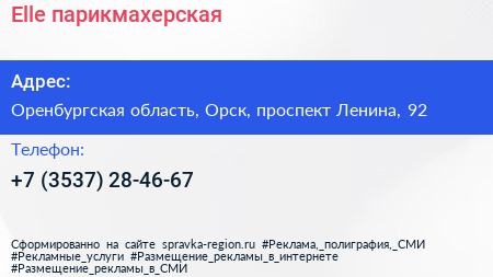 Elle, парикмахерская по адресу Оренбургская область, Орск, проспект Ленина, 92 в дальнейшем Организация, размещена в следующих категориях: