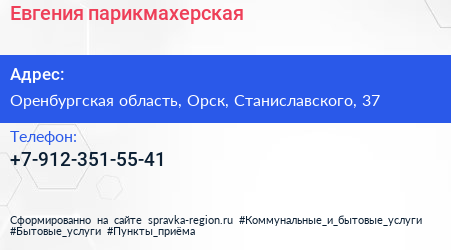 Евгения, парикмахерская по адресу Оренбургская область, Орск, Станиславского, 37 в дальнейшем Организация, размещена в следующих категориях: