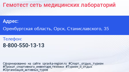 Гемотест, сеть медицинских лабораторий по адресу Оренбургская область, Орск, Станиславского, 35 в дальнейшем Организация, размещена в следующих категориях: