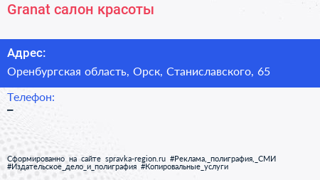 Granat, салон красоты по адресу Оренбургская область, Орск, Станиславского, 65 в дальнейшем Организация, размещена в следующих категориях: