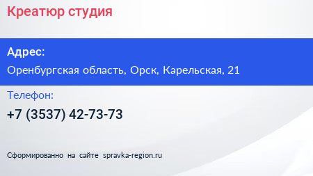 Креатюр, студия по адресу Оренбургская область, Орск, Карельская, 21 в дальнейшем Организация, размещена в следующих категориях: