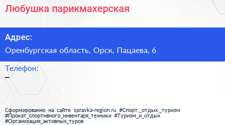 Любушка, парикмахерская по адресу Оренбургская область, Орск, Пацаева, 6 в дальнейшем Организация, размещена в следующих категориях: