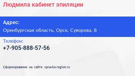 Людмила, кабинет эпиляции по адресу Оренбургская область, Орск, Суворова, 8 в дальнейшем Организация, размещена в следующих категориях: