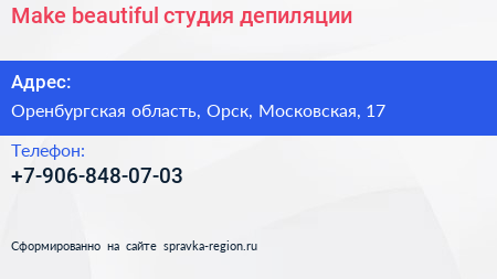 Make beautiful, студия депиляции по адресу Оренбургская область, Орск, Московская, 17 в дальнейшем Организация, размещена в следующих категориях: