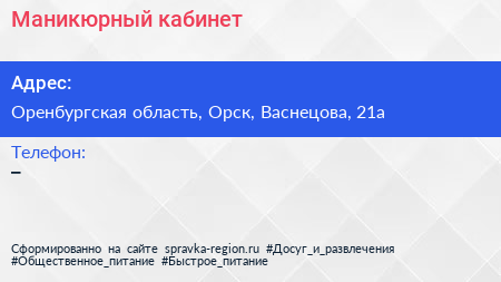 Маникюрный кабинет по адресу Оренбургская область, Орск, Васнецова, 21а в дальнейшем Организация, размещена в следующих категориях: