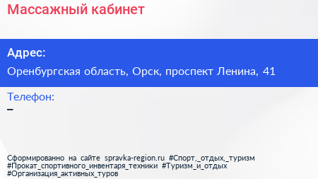 Массажный кабинет по адресу Оренбургская область, Орск, проспект Ленина, 41 в дальнейшем Организация, размещена в следующих категориях: