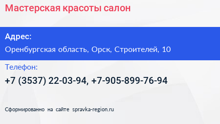 Мастерская красоты, салон по адресу Оренбургская область, Орск, Строителей, 10 в дальнейшем Организация, размещена в следующих категориях:
