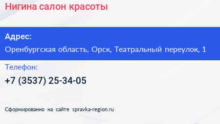 Нигина, салон красоты по адресу Оренбургская область, Орск, Театральный переулок, 1 в дальнейшем Организация, размещена в следующих категориях: