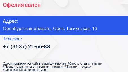 Офелия, салон по адресу Оренбургская область, Орск, Тагильская, 13 в дальнейшем Организация, размещена в следующих категориях: