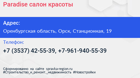 Paradise, салон красоты по адресу Оренбургская область, Орск, Станционная, 19 в дальнейшем Организация, размещена в следующих категориях: