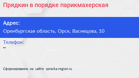 Прядкин в порядке, парикмахерская по адресу Оренбургская область, Орск, Васнецова, 10 в дальнейшем Организация, размещена в следующих категориях: