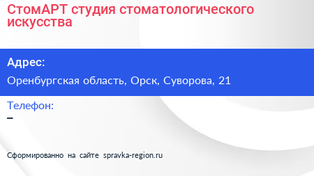 СтомАРТ, студия стоматологического искусства по адресу Оренбургская область, Орск, Суворова, 21 в дальнейшем Организация, размещена в следующих категориях:
