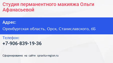 Студия перманентного макияжа Ольги Афанасьевой по адресу Оренбургская область, Орск, Станиславского, 6Б в дальнейшем Организация, размещена в следующих категориях: