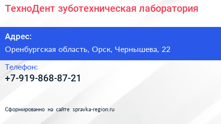 ТехноДент, зуботехническая лаборатория по адресу Оренбургская область, Орск, Чернышева, 22 в дальнейшем Организация, размещена в следующих категориях: