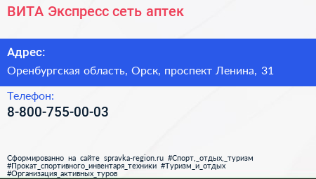 ВИТА Экспресс, сеть аптек по адресу Оренбургская область, Орск, проспект Ленина, 31 в дальнейшем Организация, размещена в следующих категориях: