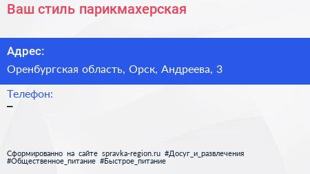 Ваш стиль, парикмахерская по адресу Оренбургская область, Орск, Андреева, 3 в дальнейшем Организация, размещена в следующих категориях: