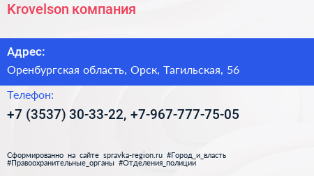 Krovelson, компания по адресу Оренбургская область, Орск, Тагильская, 56 в дальнейшем Организация, размещена в следующих категориях: