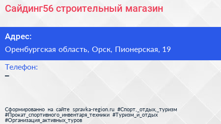 Сайдинг56, строительный магазин по адресу Оренбургская область, Орск, Пионерская, 19 в дальнейшем Организация, размещена в следующих категориях: