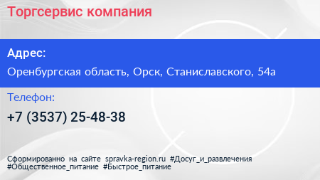 Торгсервис, компания по адресу Оренбургская область, Орск, Станиславского, 54а в дальнейшем Организация, размещена в следующих категориях: