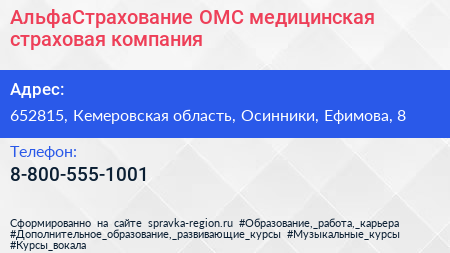 АльфаСтрахование-ОМС, медицинская страховая компания по адресу 652815, Кемеровская область, Осинники, Ефимова, 8 в дальнейшем Организация, размещена в следующих категориях: