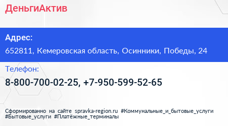 ДеньгиАктив по адресу 652811, Кемеровская область, Осинники, Победы, 24 в дальнейшем Организация, размещена в следующих категориях: