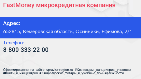 FastMoney, микрокредитная компания по адресу 652815, Кемеровская область, Осинники, Ефимова, 2/1 в дальнейшем Организация, размещена в следующих категориях: