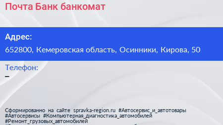 Почта Банк, банкомат по адресу 652800, Кемеровская область, Осинники, Кирова, 50 в дальнейшем Организация, размещена в следующих категориях: