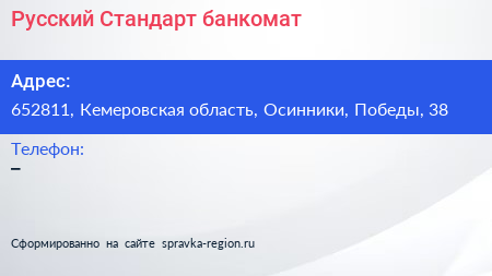 Русский Стандарт, банкомат по адресу 652811, Кемеровская область, Осинники, Победы, 38 в дальнейшем Организация, размещена в следующих категориях: