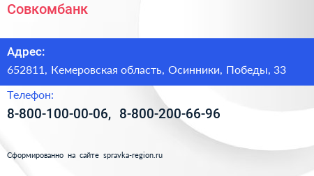 Совкомбанк по адресу 652811, Кемеровская область, Осинники, Победы, 33 в дальнейшем Организация, размещена в следующих категориях: