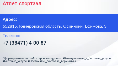 Атлет, спортзал по адресу 652815, Кемеровская область, Осинники, Ефимова, 3 в дальнейшем Организация, размещена в следующих категориях: