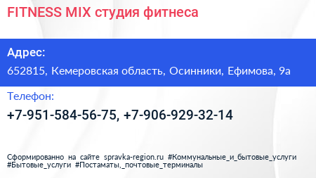 FITNESS MIX, студия фитнеса по адресу 652815, Кемеровская область, Осинники, Ефимова, 9а в дальнейшем Организация, размещена в следующих категориях: