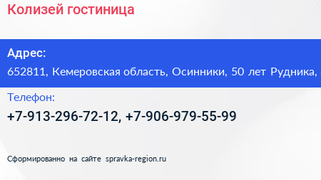 Колизей, гостиница по адресу 652811, Кемеровская область, Осинники, 50 лет Рудника, 8 в дальнейшем Организация, размещена в следующих категориях: