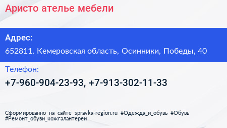 Аристо, ателье мебели по адресу 652811, Кемеровская область, Осинники, Победы, 40 в дальнейшем Организация, размещена в следующих категориях: