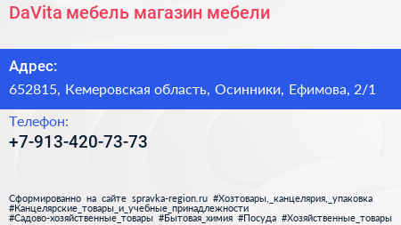 DaVita-мебель, магазин мебели по адресу 652815, Кемеровская область, Осинники, Ефимова, 2/1 в дальнейшем Организация, размещена в следующих категориях: