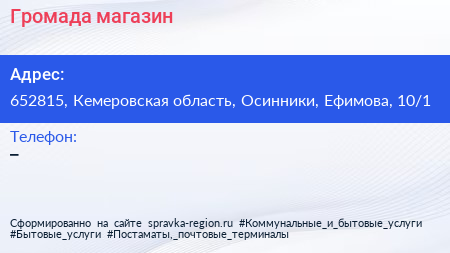 Громада, магазин по адресу 652815, Кемеровская область, Осинники, Ефимова, 10/1 в дальнейшем Организация, размещена в следующих категориях: