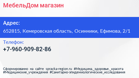 МебельДом, магазин по адресу 652815, Кемеровская область, Осинники, Ефимова, 2/1 в дальнейшем Организация, размещена в следующих категориях: