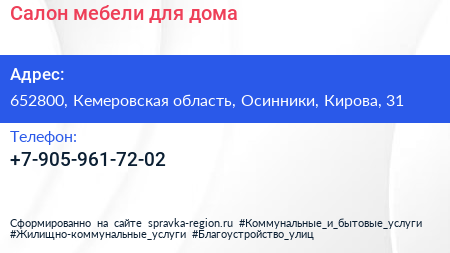 Салон мебели для дома по адресу 652800, Кемеровская область, Осинники, Кирова, 31 в дальнейшем Организация, размещена в следующих категориях: