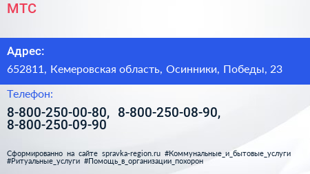 МТС по адресу 652811, Кемеровская область, Осинники, Победы, 23 в дальнейшем Организация, размещена в следующих категориях: