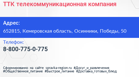 ТТК, телекоммуникационная компания по адресу 652815, Кемеровская область, Осинники, Победы, 50 в дальнейшем Организация, размещена в следующих категориях: