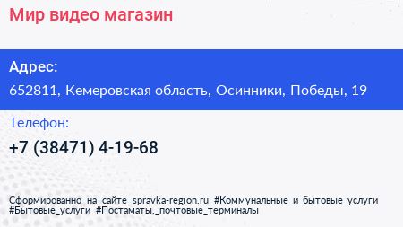 Мир видео, магазин по адресу 652811, Кемеровская область, Осинники, Победы, 19 в дальнейшем Организация, размещена в следующих категориях: