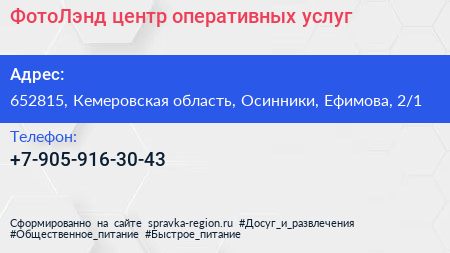 ФотоЛэнд, центр оперативных услуг по адресу 652815, Кемеровская область, Осинники, Ефимова, 2/1 в дальнейшем Организация, размещена в следующих категориях: