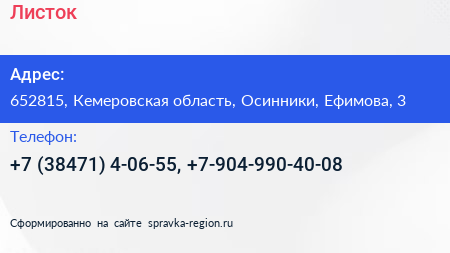 Листок по адресу 652815, Кемеровская область, Осинники, Ефимова, 3 в дальнейшем Организация, размещена в следующих категориях: