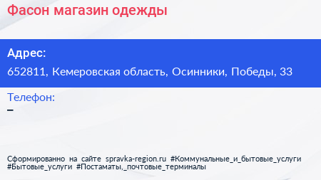 Фасон, магазин одежды по адресу 652811, Кемеровская область, Осинники, Победы, 33 в дальнейшем Организация, размещена в следующих категориях: