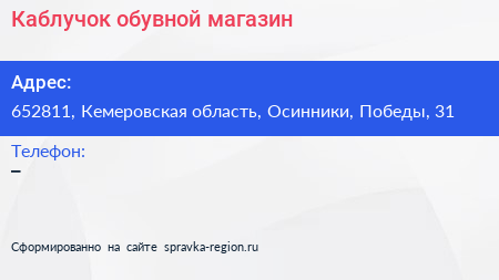 Каблучок, обувной магазин по адресу 652811, Кемеровская область, Осинники, Победы, 31 в дальнейшем Организация, размещена в следующих категориях: