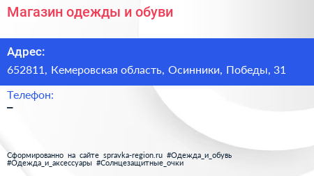 Магазин одежды и обуви по адресу 652811, Кемеровская область, Осинники, Победы, 31 в дальнейшем Организация, размещена в следующих категориях: